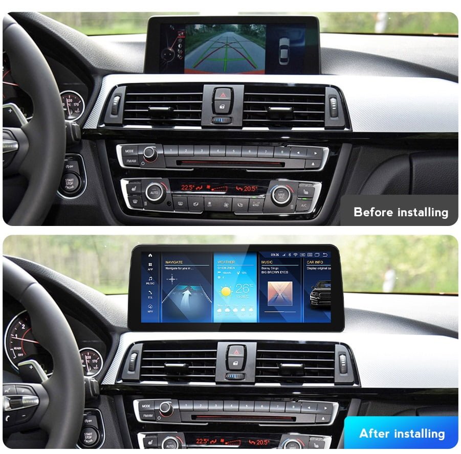 BMW 3 / 4 serie fabrikkskjerm vs etter installasjonen android bilstereo multimedia: