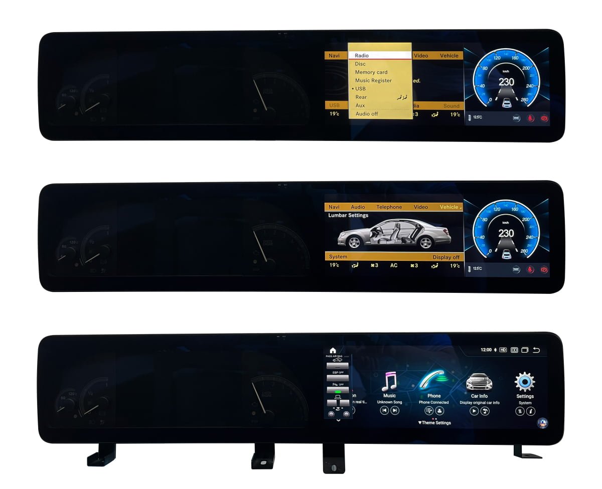 Skjermen støtter alle Mercedes originale funksjoner, inkludert rattknapper, bilinformasjon som vist på den eksisterende originalskjermen. t,eks I-Drive-kontroll, original ryggekamera (hvis tilgjengelig), parkeringssensorer, hastighet, eksisterende radio- og CD-funksjonen, innstillinger osv. Denne skjermen er kompatibel med lydsystemet enten det er fiber-optisk eller vanlig lydanlegg.